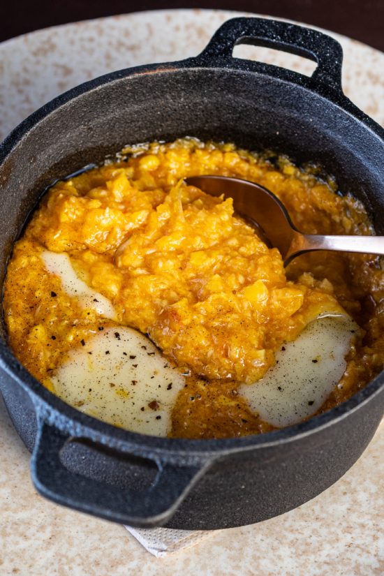 Pulpo braseado acompañado con puré de boniatos y patata asada
