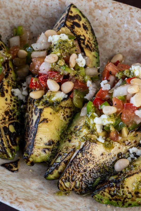 Queso Provolone fundido a las brasas con tomate y pimientos rojos